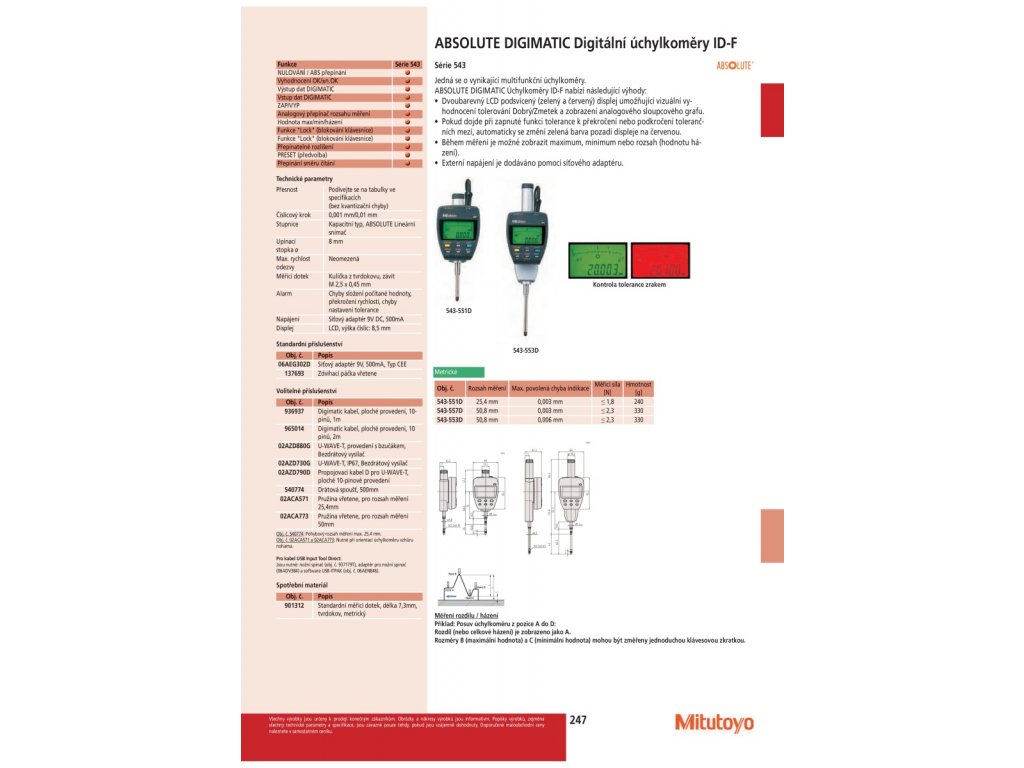 Jedná se o vynikající multifunkční úchylkoměry. ABSOLUTE DIGIMATIC Úchylkoměry ID-F nabízí následující výhody: Dvoubarevný LCD podsvícený (zelený a červený) displej umožňující vizuální vyhodnocení tolerování Dobrý/Zmetek a zobrazení analogového sloupcového grafu. Pokud dojde při zapnuté funkci tolerance k překročení nebo podkročení tolerančních mezí, automaticky se změní zelená barva pozadí displeje na červenou. Během měření je možné zobrazit maximum, minimum nebo rozsah (hodnotu házení). Externí napájení je dodáváno pomocí síťového adaptéru.Doplňkové parametry