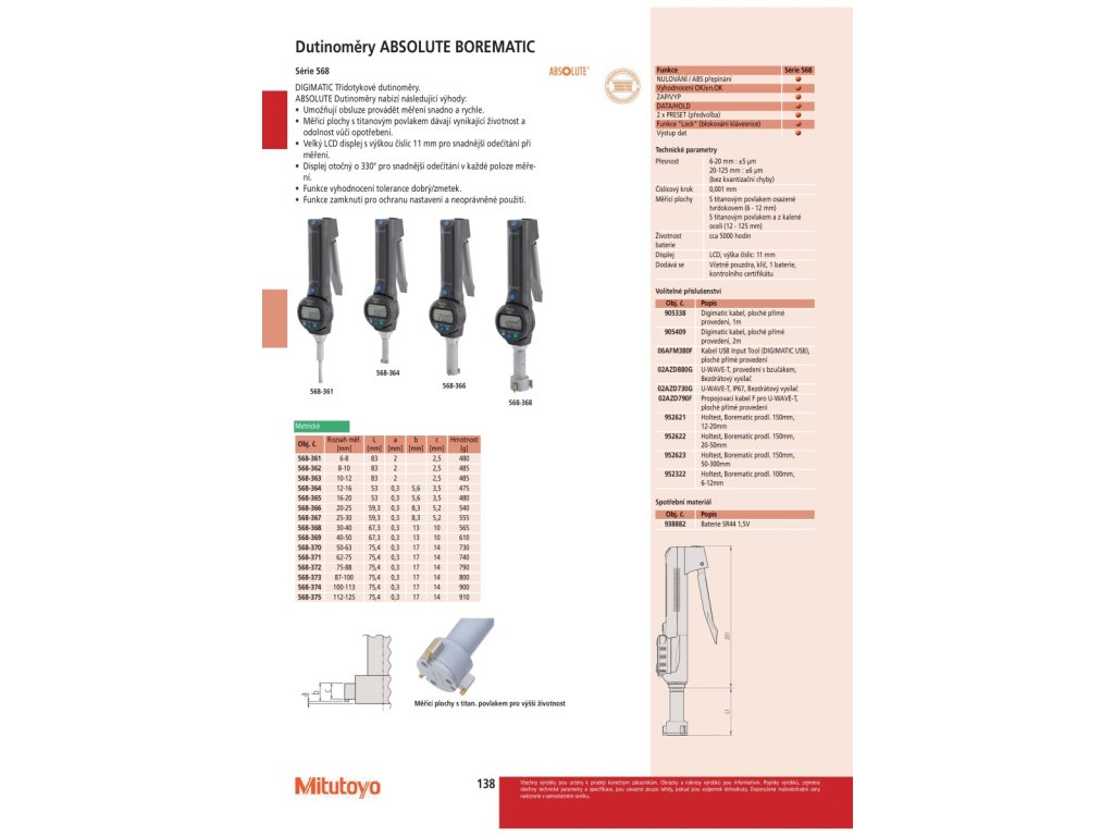 DIGIMATIC Třídotykové dutinoměry. ABSOLUTE Dutinoměry nabízí následující výhody: Umožňují obsluze provádět měření snadno a rychle. Měřicí plochy s titanovým povlakem dávají vynikající životnost a odolnost vůči opotřebení. Velký LCD displej s výškou číslic 11 mm pro snadnější odečítání při měření. Displej otočný o 330° pro snadnější odečítání v každé poloze měření. Funkce vyhodnocení tolerance dobrý/zmetek. Funkce zamknutí pro ochranu nastavení a neoprávněné použití.Doplňkové parametry