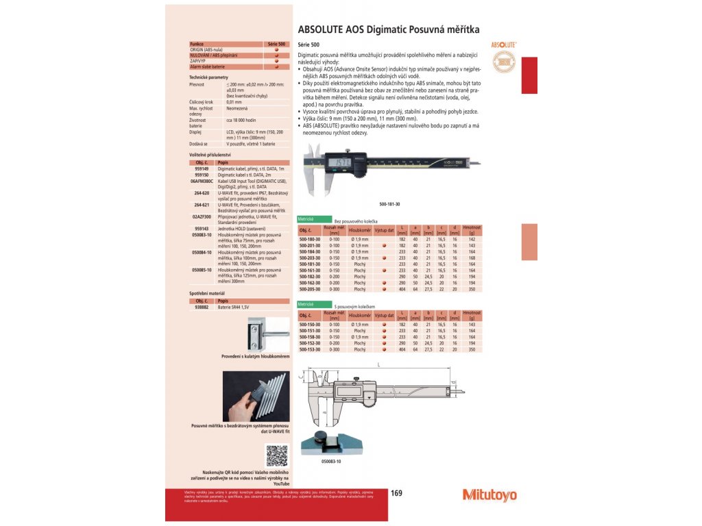 - Digimatic posuvná měřítka umožňující provádění spolehlivého měření a nabízející následující výhody: Obsahují AOS (Advance Onsite Sensor) indukční typ snímače používaný v nejpřesnějších ABS posuvných měřítkách odolných vůči vodě.
