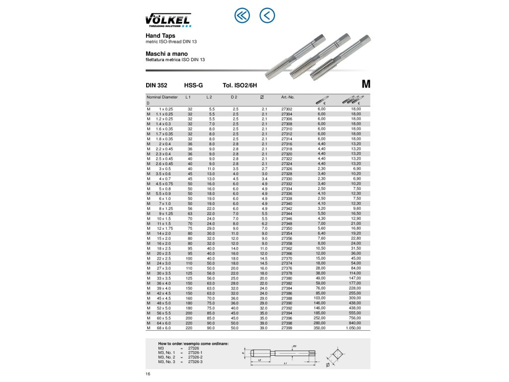 Sada ručních závitníků M - HSS-G - DIN 352Tolerance ISO2/6H