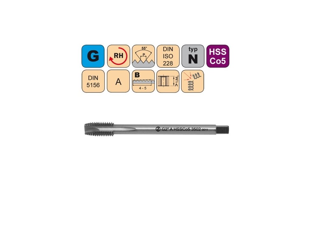 Strojní závitník pro trubkový závit s přímou drážkou a lamačem třísek, DIN 5156, vhodný pro konstrukční oceli, automatové oceli, slitiny mědi tvořící krátkou třísku, alternativně pro šedou litinu, slitiny hliníku.Doplňkové parametry