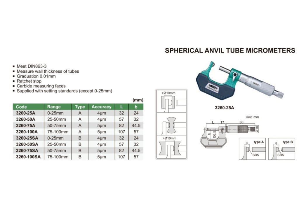 Třmenový mikrometr s kulovým nebo válcovým pevným dotekem INSIZE, typ A, typ 3260