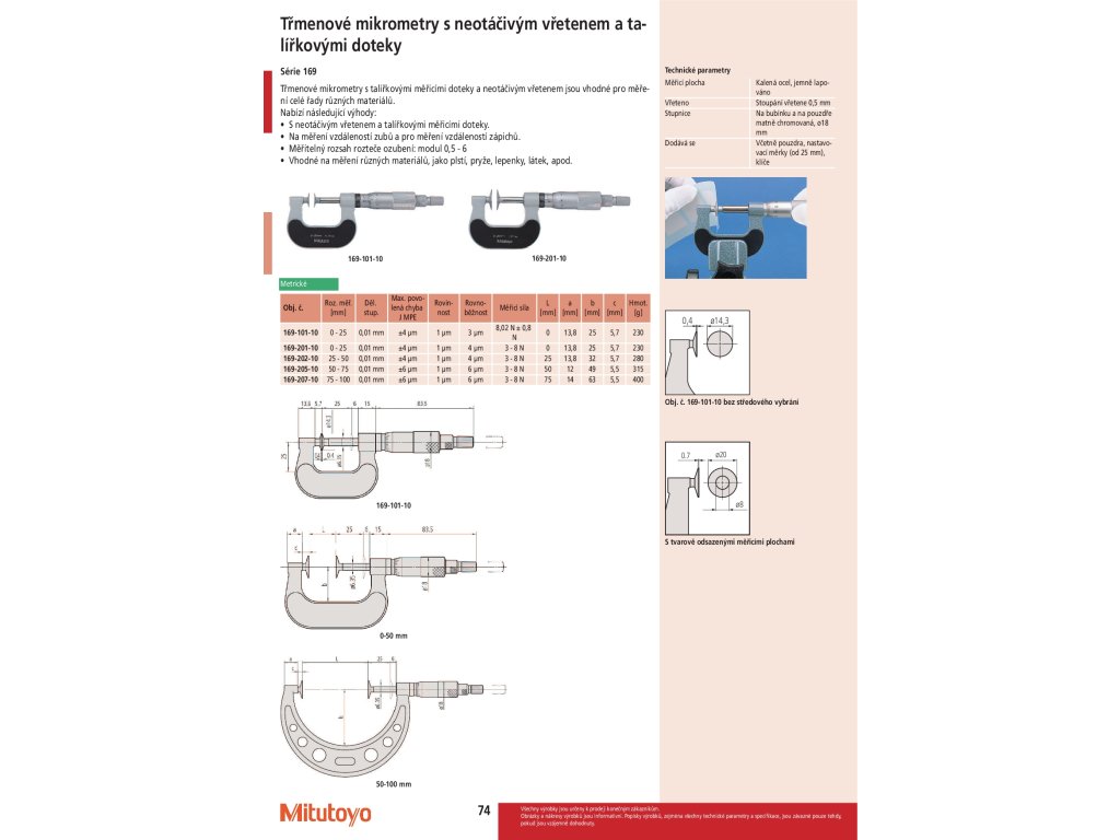 Třmenový mikrometr s neotáčivým vřetenem a talířkovými doteky MITUTOYO