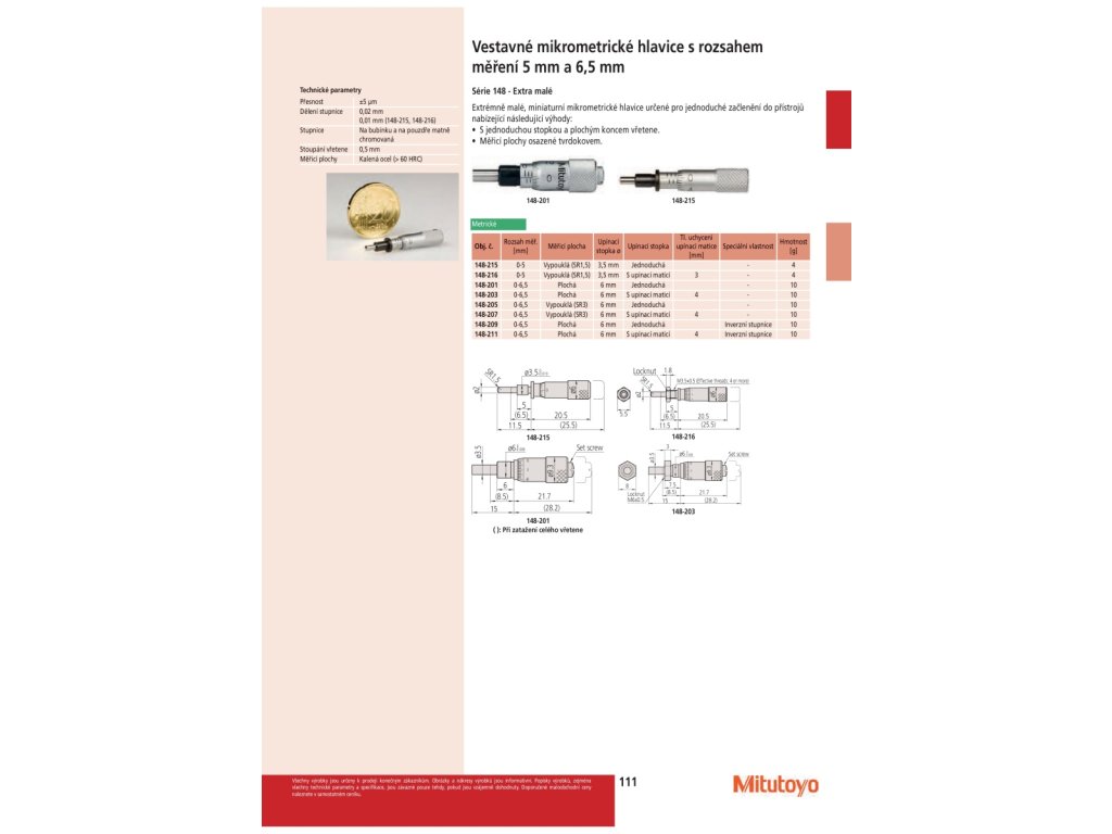 Extrémně malé, miniaturní mikrometrické hlavice určené pro jednoduché začlenění do přístrojů nabízející následující výhody: S jednoduchou stopkou a plochým koncem vřetene. Měřicí plochy osazené tvrdokovem.Doplňkové parametry