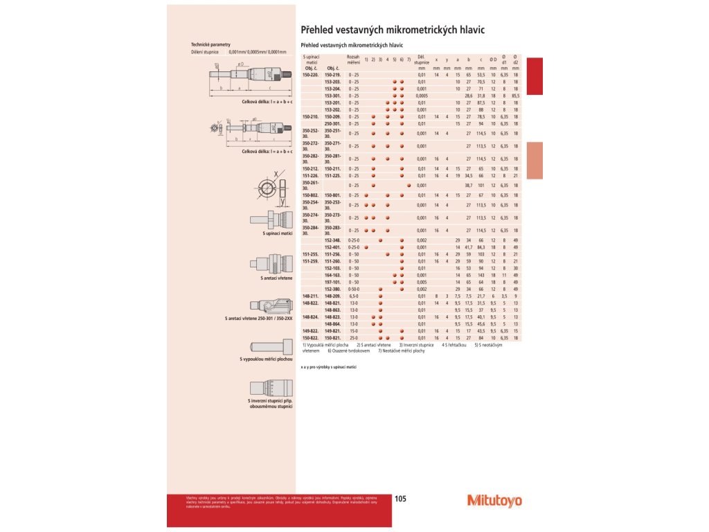 Mikrometrické hlavice s možností zaaretování vřetene v libovolné pozici pomocí vroubkovaného zajišťovacího šroubu.Doplňkové parametry